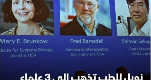 عاجل / العالمة ماري برونكو والعالمان فريد رامسديل وشيمون ساكاجوتشي يفوزون بجائزة نوبل في الطب لعام 2025م…