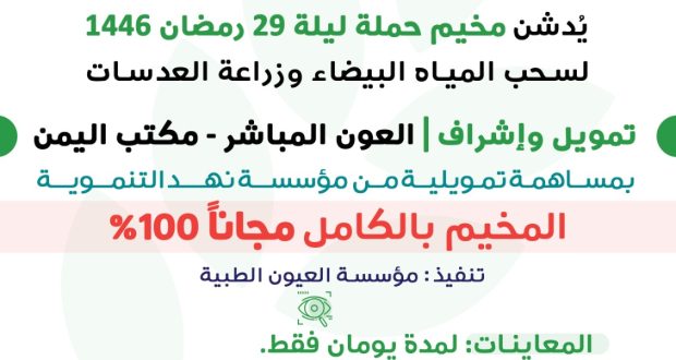 سيقام بمحافظة تعز في مديرية المخاء فعاليات مخيم حملة “ليلة 29 رمضان 1446هـ” لسحب المياه البيضاء وزراعة العدسات مجانًا بنسبة 100%، وذلك برعاية معالي وزير الصحة العامة والسكان ومحافظ محافظة تعز، وبالتنسيق مع وزارة التخطيط والتعاون الدولي، والإدارة العامة للمخيمات بوزارة الصحة العامة والسكان، ومكتب الصحة العامة والسكان بالمحافظة.
