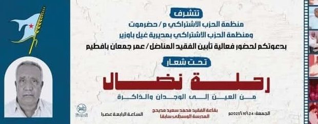 برعاية منظمة #الحزب_الاشتراكي_اليمني بمحافظة حضرموت، وبالتنسيق مع منظمة الحزب بمديرية غيل باوزير، تُقام فعالية تأبينية للفقيد المناضل عمر جمعان تحت شعار: