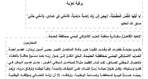 بقلوبٍ مؤمنةٍ بقضاء الله وقدره، تلقينا خبر وفاة المناضل الكبير يحيى أمين زيدان، عضو لجنة الحزب الاشتراكي اليمني بمحافظة الحديدة، الذي انتقل إلى جوار ربه بعد مسيرةٍ حافلةٍ بالعطاء والنضال الوطني الصادق، لقد كان الفقيد مثالاً للمناضل الوطني الغيور، حمل هموم الوطن في فكره وسلوكه، وظل طوال حياته رمزاً للثبات على الموقف والمبدأ، وفياً لوطنه ولرفاق دربه، ويُعد رحيله خسارةً كبيرة للمحافظة وللساحة الوطنية، ولرفاقه، إلا أن إرثه النضالي ومواقفه الوطنية ستظل نبراساً يضيء دروب الأحرار والشرفاء.