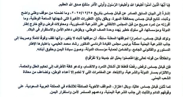 وفي ختام البيان، أكدت قبائل جساس أن موقفها نابع من مسؤولية وطنية وقبلية وأخلاقية، وأنها ستظل ثابتة مع الشرعية والدولة، وكل ما من شأنه الحفاظ على وحدة اليمن وسيادته وأمنه واستقراره وكرامة أبنائه.