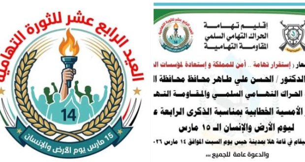 يدعوكم الحراك التهامي السلمي والمقاومة التهامية لحضور الأمسية الخطابية بمناسبة الذكرى الرابعة عشر ليوم الأرض والإنسان ال 15 مارس