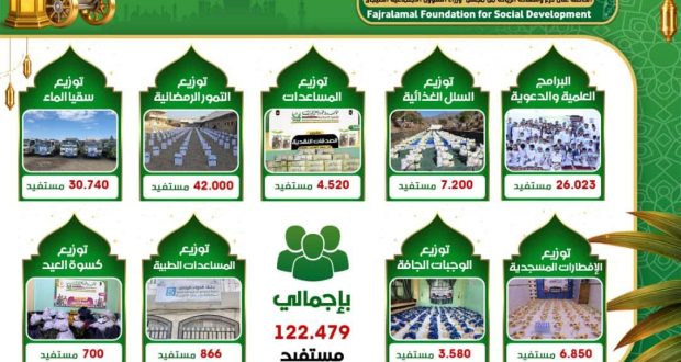 مؤسسة فجر الأمل تختتم أعمالها الرمضانية بتقديم خدمات خيرية واجتماعية لأكثر من 122 ألف مستفيد