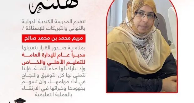 أعلنت المدرسة الكندية الدولية في العاصمة عدن، في بيان لها تهنئة، تعيين الأستاذة مريم محمد بن محمد صالح مديرًا عامًا للإدارة العامة للتعليم الأهلي والخاص في العاصمة عدن، في خطوة تعكس توجهات دعم وتطوير قطاع التعليم غير الحكومي في البلاد.