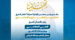 تقدّم رئيس مجلس إدارة شركة أحلام الشرق للتطوير العقاري والاستثماري، رجل الأعمال الشيخ فتحي المفلحي، بأسمى آيات التهاني والتبريكات للدكتور مختار الخضر عبدالله الرباش، وذلك بمناسبة تعيينه محافظًا لمحافظة أبين. وأعرب المفلحي عن خالص تهانيه وتمنياته للدكتور مختار الرباش بالتوفيق والنجاح في أداء مهامه الوطنية، متمنيًا له التوفيق والسداد في قيادة دفة العمل الإداري والتنموي في محافظة أبين ...